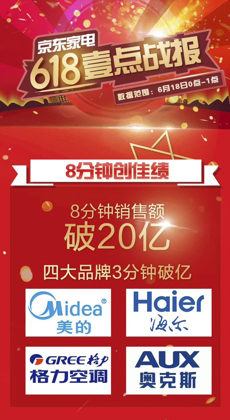 「6 月 18 日 0 时起,电视品类 1 分钟破亿!冰洗 2 分钟 3 亿!空调 3 分钟 5 亿!整体销售额 8 分钟破 20 亿元!」京东家电事业部总裁刘俊在 618 当日举行的京东媒体开放日上表示,京东家电再一次以创纪录的成绩交出了完美答卷!刘俊同时指出,消费者信任京东、厂商支持京东、友商「学习」京东,是京东家电得以不断超越的根本原因。