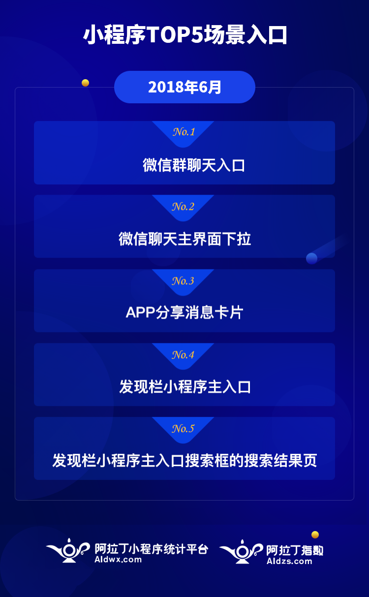 根据阿拉丁小程序统计平台的数据显示,微信如今已经开放小程序 64 个场景入口,下图是 2018 年 6 月依据累计用户访问量排序的 TOP5 场景入口值,场景入口前十分别是微信群聊入口、微信聊天主界面下拉、App 分享信息卡片、发现栏小程序主入口、发现栏小程序主入口搜索框的搜索结果页。从 TOP5 场景入口可以看出,首先,分享小程序信息卡片占据主体,用户更多通过彼此的分享过来的,这是裂变的基础;其次,微信聊天主界面下拉位居第二位,占有非常重要的地位。