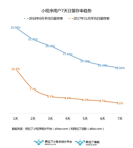 2018 年 6 月小程序用户的平均日留存率相比去年 11 月大幅上升,一方面是由于微信在 2017 年底开放的「微信聊天主界面下拉」入口,这一快捷入口让小程序的访问更加方便,也逐渐让一些用户养成了在微信中使用小程序进行信息查询、购物、娱乐等习惯;另一方面,小游戏的火爆以及其游戏本身具备的高粘性的特点也让用户访问小程序的频率大幅提升,从而提高了小程序的用户留存率。