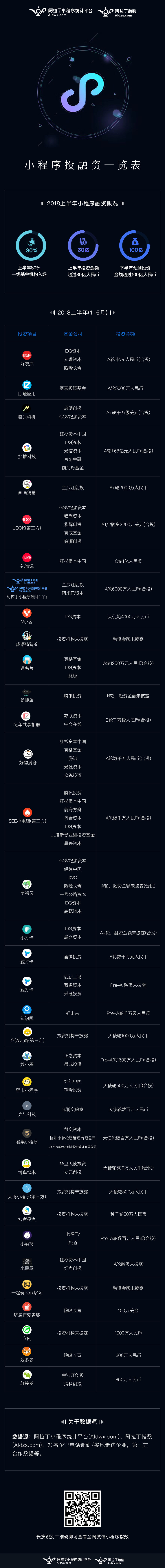但抛开对风口的追逐,基于微信这样一个中心化的社交平台,无论是从用户的使用习惯、便利性还是产品的传播角度,小程序的形态都是一个绝对值得关注的赛道。虽然在小程序刚刚出来的时候,很多人还是抱有怀疑态度的,但随着今年微信给了小程序更多的入口和流量,B 端开发者数量的猛增,投资人已经开始疯狂布局,从表中可以清晰的看到一线基金 80% 已经入场,上半年进场投资资金超过 30 亿人民币,包括金沙江、红杉中国、险峰长青、IDG、真格基金等。