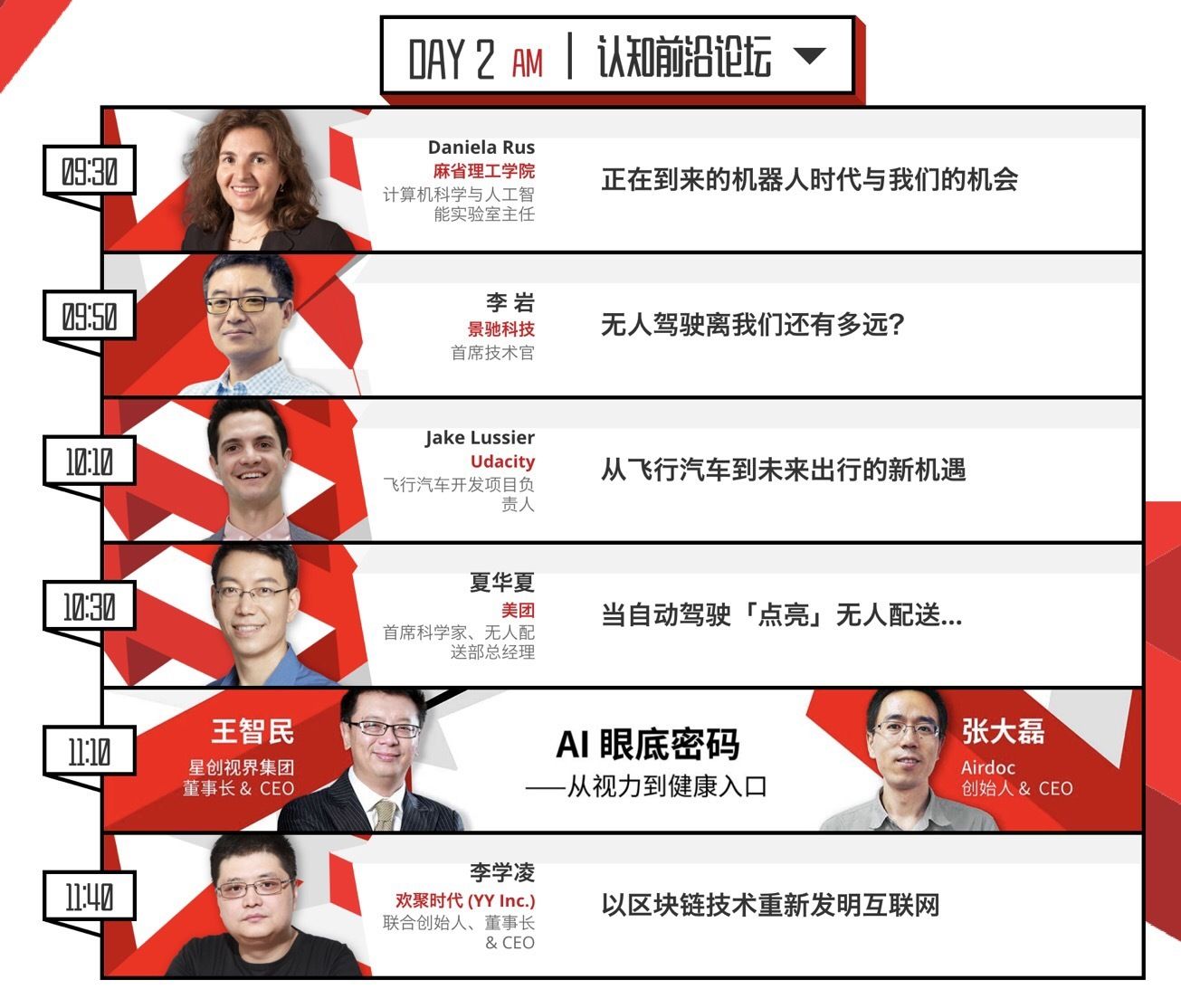 第二天的认知前沿论坛上,来自 MIT 的计算机科学与人工智能实验室主任 Daniela Rus、景驰科技 CTO 李岩、Udacity 飞行汽车开发项目负责人 Jake Lussier、美团点评首席科学家夏华夏、星创视界董事长王智民、Airdoc 创始人张大磊以及欢聚时代联合创始人、董事长 & CEO 李学凌都将到场发表演讲,讨论时下日渐成熟的技术将如何改变未来。