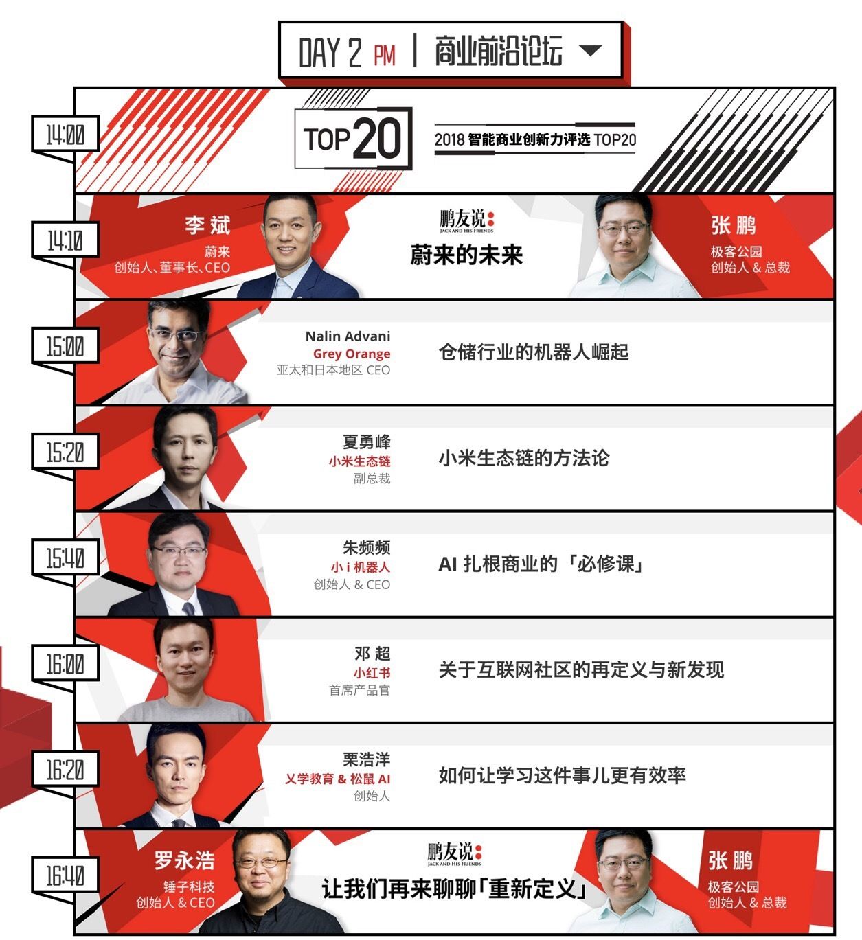 第二天下午的商业前沿论坛上,极客公园将发布「2018 智能商业创新力评选 TOP20」榜单。