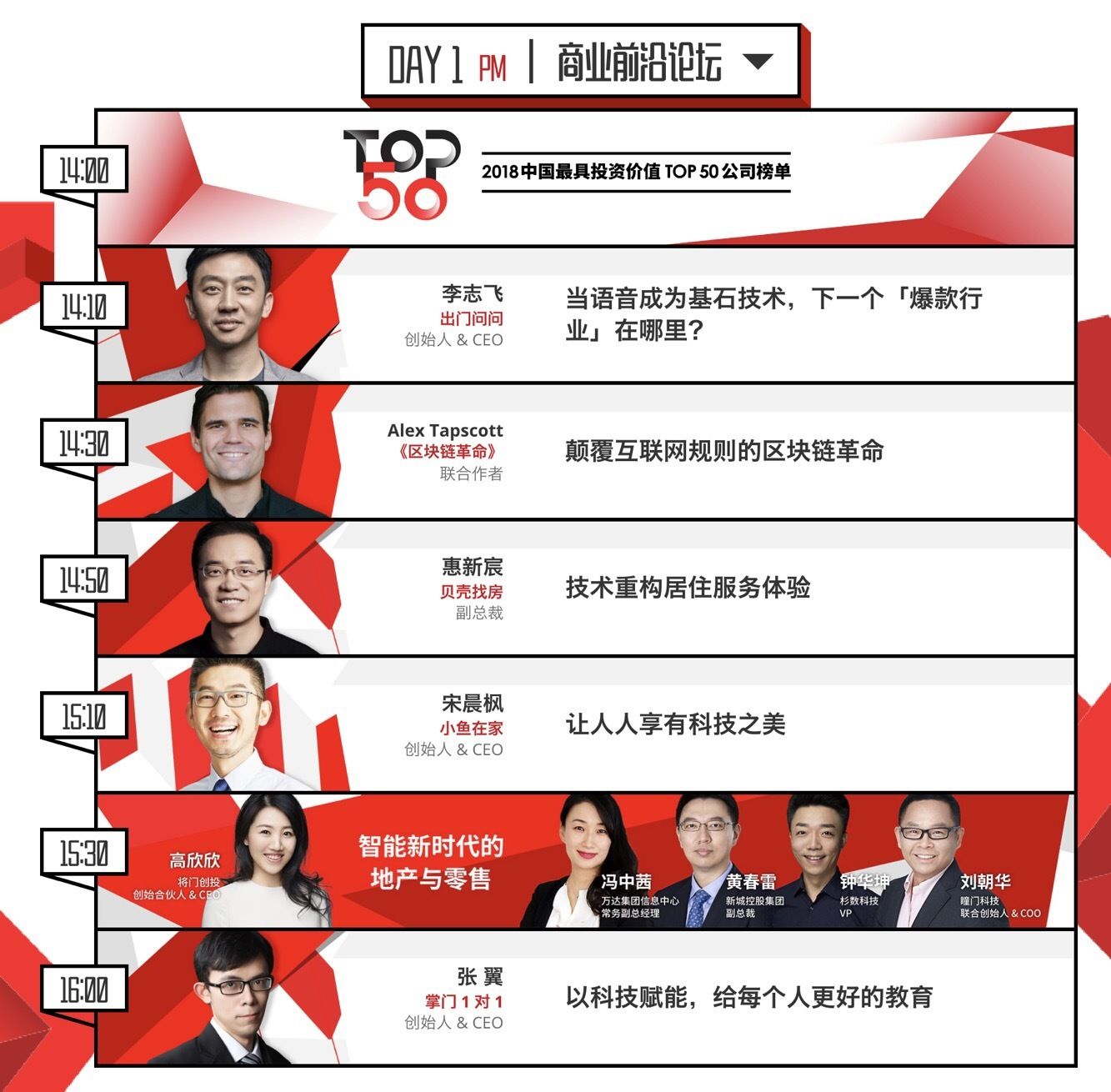 第一天的下午是商业前沿论坛。活动上,极客公园旗下变量资本将发布「2018 中国最具投资价值 TOP 50 公司榜单」。紧接着,来自出门问问的创始人& CEO 李志飞、《区块链革命》的作者 Alex Tapscott、贝壳找房副总裁惠新宸、小鱼在家的创始人& CEO 宋晨枫以及掌门 1 对 1 的创始人 & CEO 将发表演讲。同时,将门创投的创始合伙人 & CEO 高欣欣将主持一场主题为「智能新时代地产与零售」的圆桌会谈。