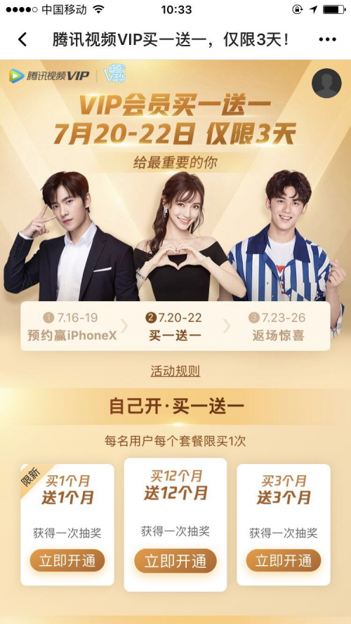 腾讯视频于 7 月 20 日起, 连续 3 天推出 VIP 限时买一送一暑期福利。腾讯视频所有 VIP 套餐均参加本次活动, 即, 买一季送一季, 买一年送一年, 新会员买一月送一月。加量不加价, 很值有木有! 限时促销期间, 购买套餐, 还可以获得抽奖机会。无人机、戴森电吹风等礼品, 都是腾讯视频为 VIP 精心准备的礼物。