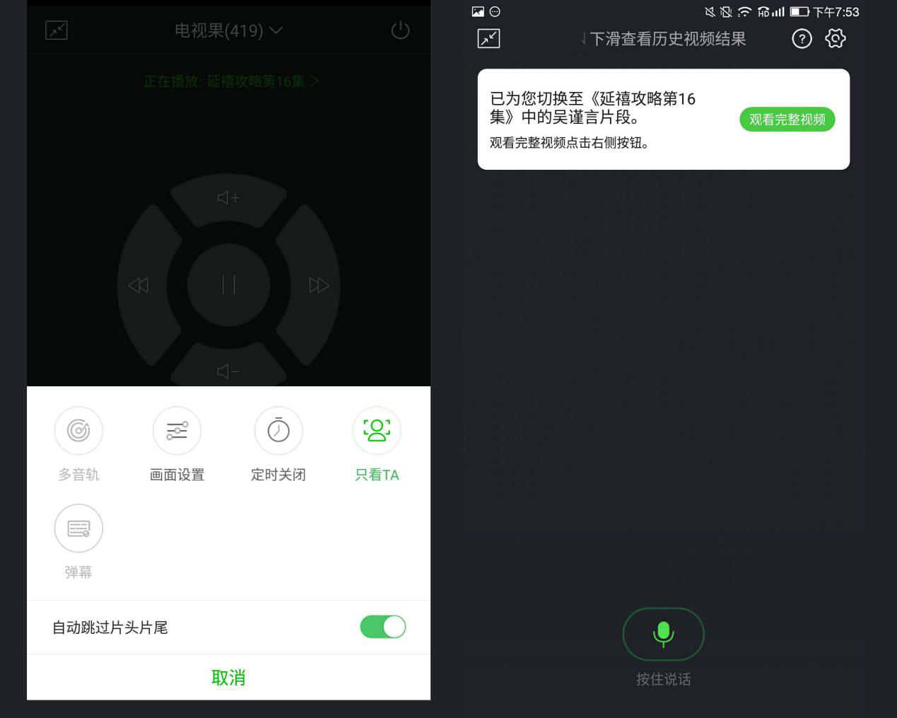 「只看 TA」功能有两种方式开启,以爱奇艺正在热播的《延禧攻略》为例,只要说出想看的角色或演员姓名,比如「只看魏璎珞」或「只看吴谨言」语音指令,电视果便会自动播放魏璎珞的精彩片段。也可以从电视果的遥控界面,选择「只看 TA」按钮会弹出演员列表,点击演员姓名即可。
