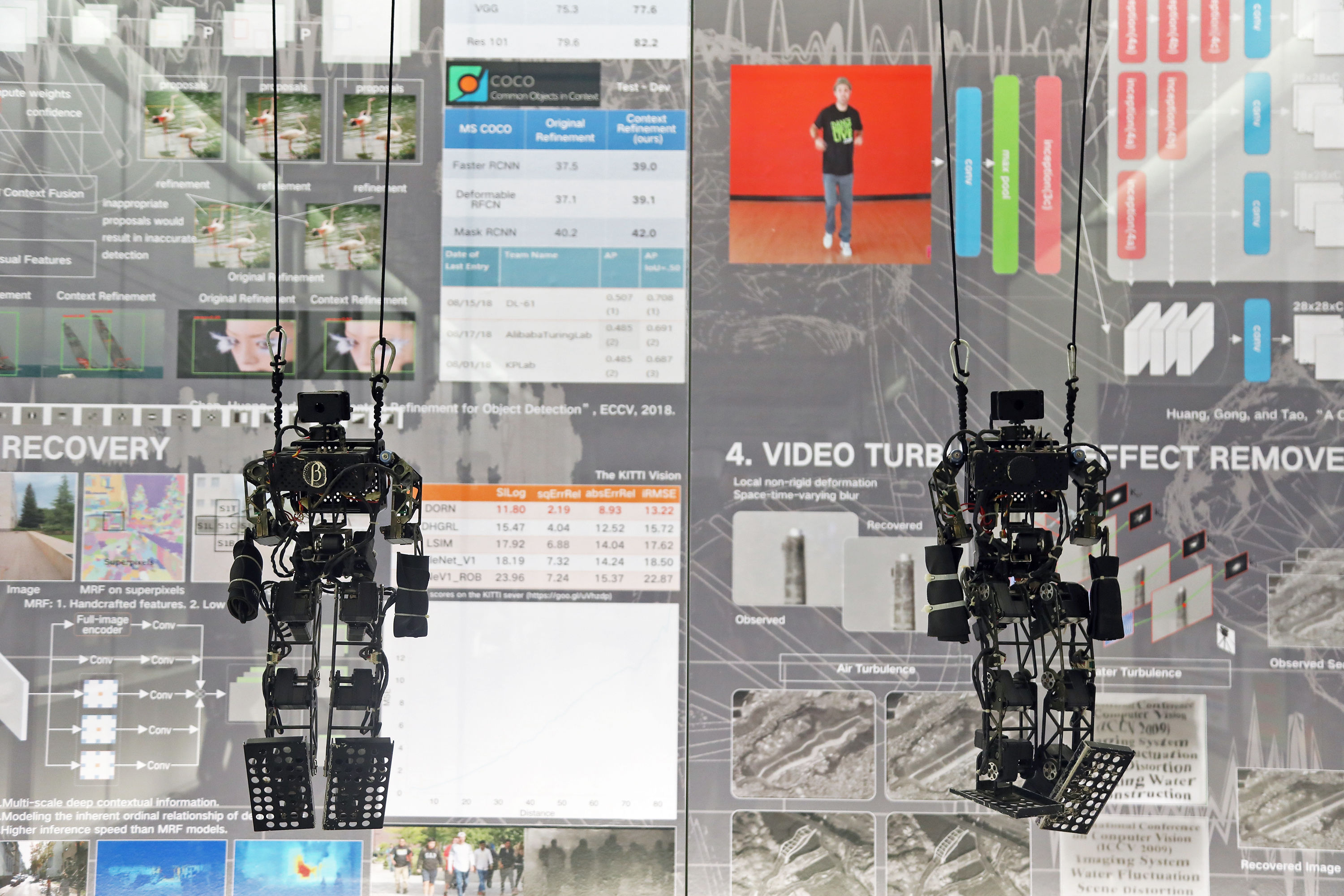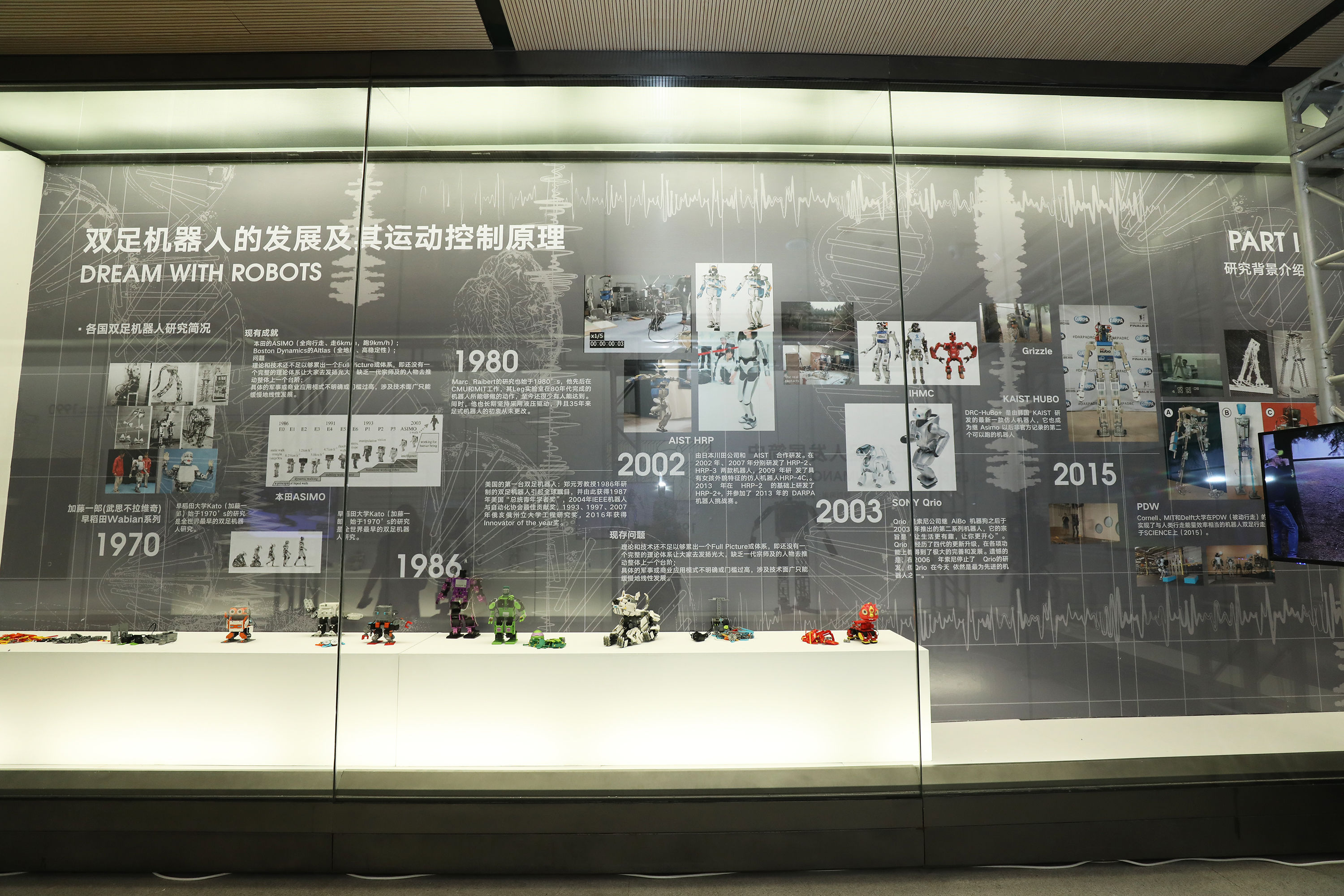 通过现场大型展板上的介绍文字和视频资料,观众可以了解人形机器人的发展简史与大事记,同时,现场还展出了多款由优必选机器人零件、半成品和成品组成的艺术展品,多台悬挂空中的优必选双足机器人模型更是极具科技感。通过欣赏由机器人打造的艺术品,观众可以更为直观地感受人形机器人逐渐丰富、精细的功能及造型。艺术结合科技元素的呈现方式,给现场观众留下了深刻的印象。