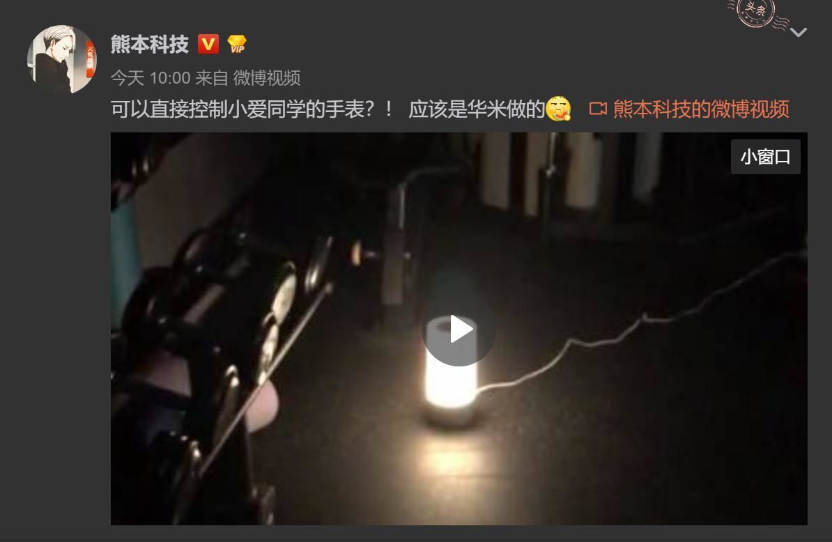根据博主爆料的视频内容显示,操作者在手机上划拉了两下,使用语音指令「小爱同学,打开灯」便打开了旁边的智能灯。且 @ 熊本科技在微博文字也做了清晰的说明「可以直接控制小爱同学的手表」,可能是华米做的。