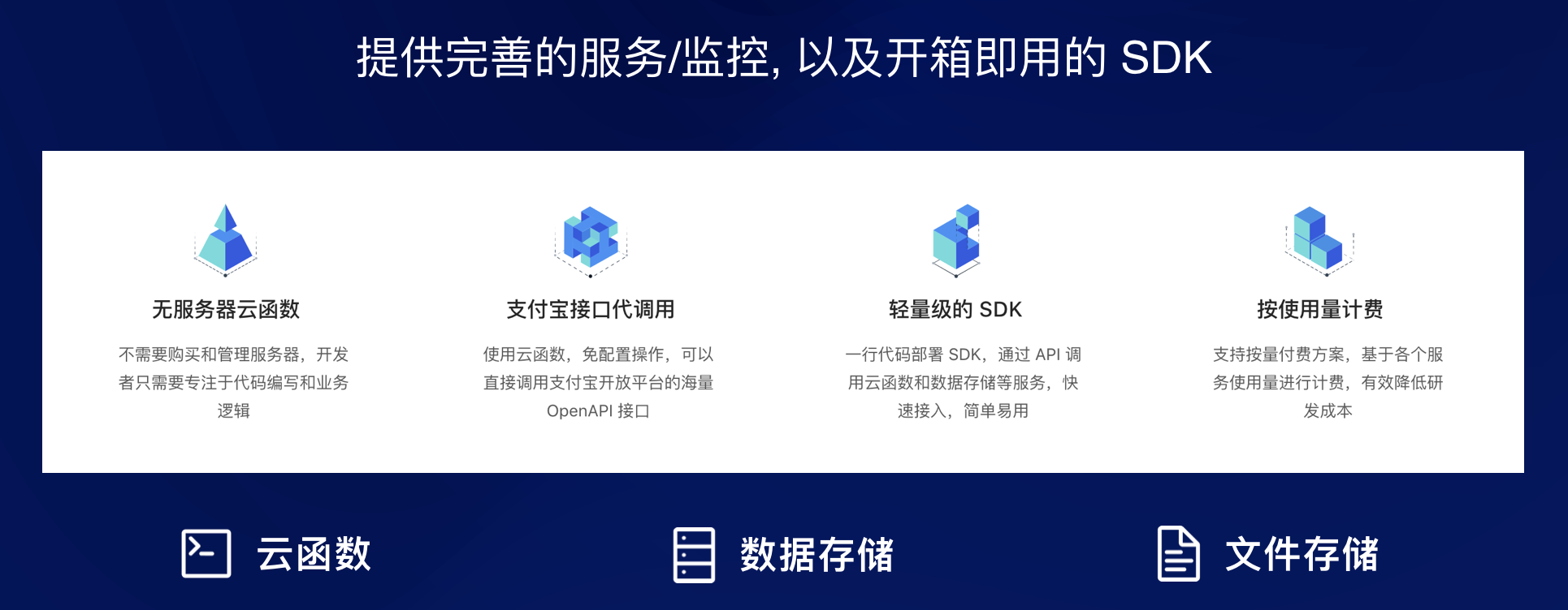 该服务为小程序开发者提供了完整的云端支持,让开发者无需自己搭建服务器,即可实现支付宝小程序的快速上线和迭代。大大节省开发成本、加快开发速度。