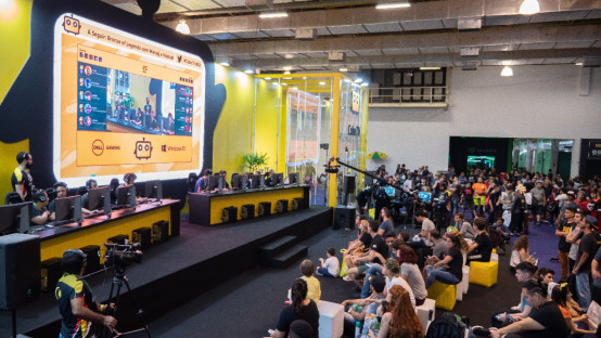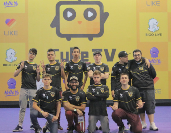 巴西本土知名电竞俱乐部:IDM Gaming 在巴西游戏展现场,身后则是 BIGO 公司出海的四大产品 LOGO。