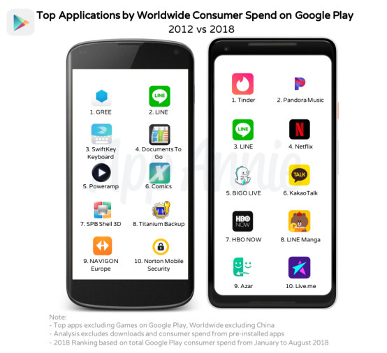 Google Play 全球氪金榜 2012 年(左)与 2018 年(右)对比。来源:App Annie
