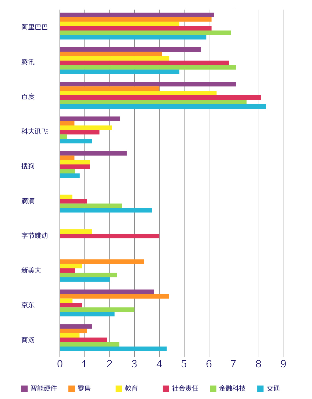 各家的落地应用优势不尽相同,其中阿里在零售领域有极大优势,排名业界第一;百度发展均衡,不仅在交通领域持续保持着其霸主地位,在科技金融、社会责任、教育、智能硬件上都领先于行业;起步较晚的腾讯虽各版块均有布局,在社交、游戏、内容方面都有涉猎,但整体相较于百度和阿里还有一定差距。