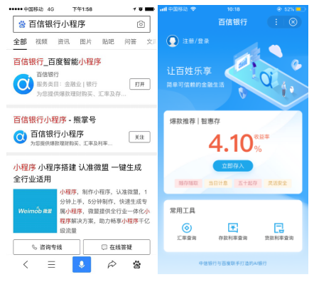 百信银行智能小程序是百信银行基于百度小程序的工具属性设计的一款金融工具。用户打开手机百度 APP,搜索【百信银行小程序】即可查看使用。同时,用户也可以通过首页点击语音搜索 (小话筒),语音「百信银行小程序」「汇率查询小程序」、「贷款利率小程序」、「存款利率小程序」等任意关键词直达小程序。