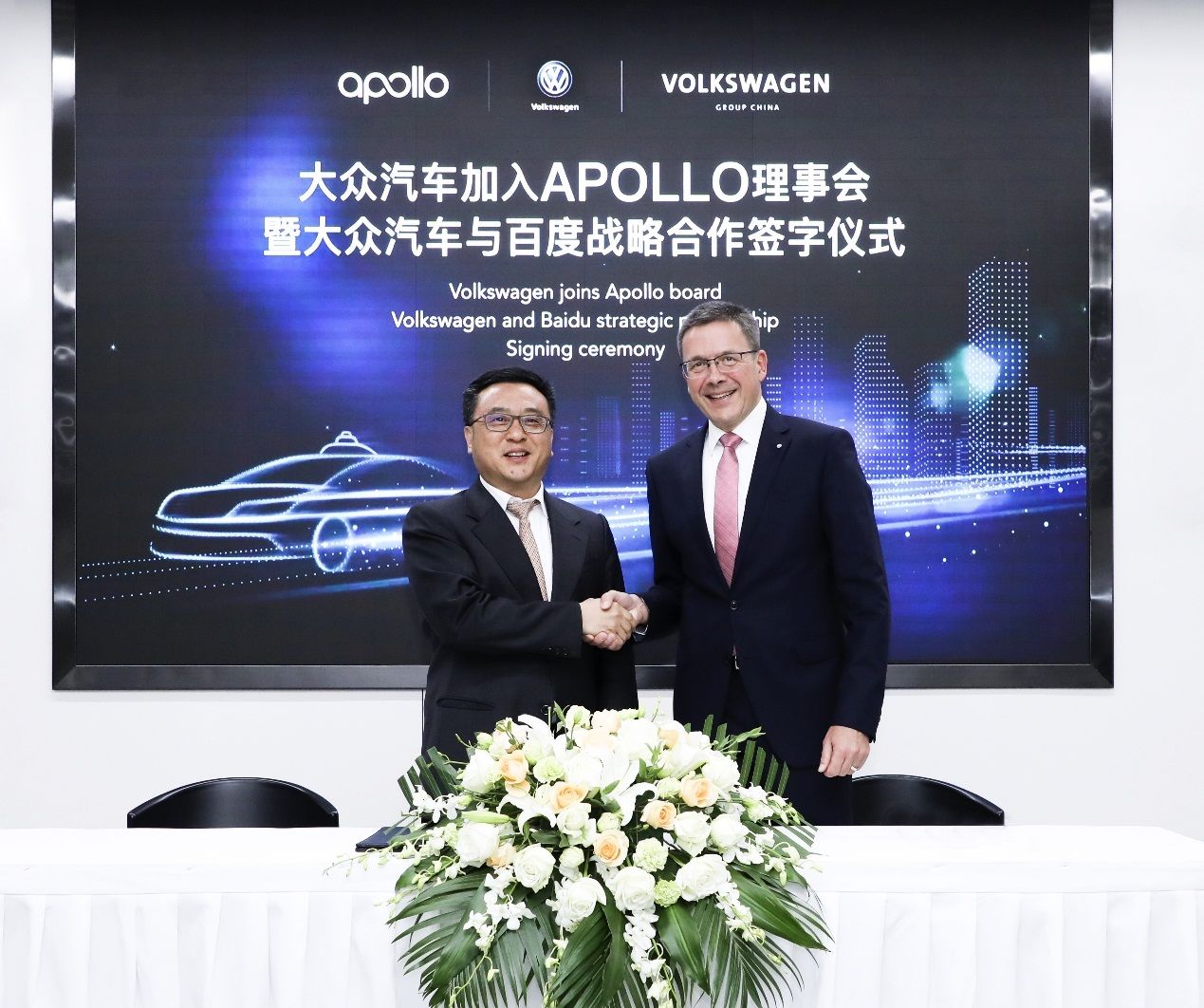 百度总裁张亚勤博士、百度副总裁、智能驾驶事业群组总经理李震宇、大众汽车(中国)投资有限公司执行副总裁、亚洲研发技术中心负责人杜思凯先生(Mr. Sven Patuschka)等双方领导出席会议。至此,百度 Apollo 生态圈再添大将,双方联合进行的研发项目将进一步强化大众汽车与中国的联系,更将为全球自动驾驶技术驱动落地点燃新引擎。
