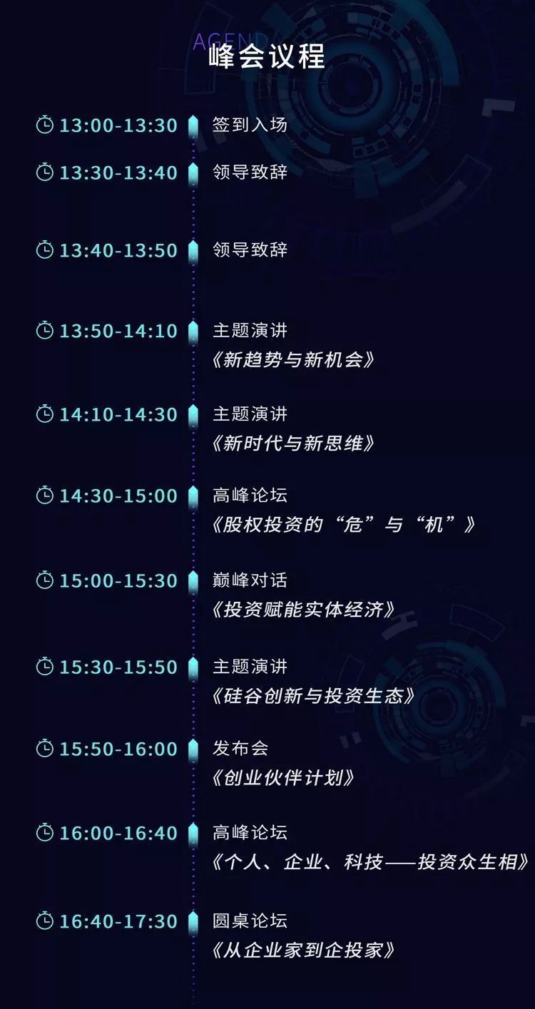 峰会秉承传统, 革故鼎新, 携手行业知名学者与重磅嘉宾, 解析政策趋势、聚焦投资策略、探索价值发现、前瞻市场未来。并通过主题分享、圆桌论坛、大佬对话等多样化形式, 就核心议题展开深入探讨, 议题涉及股权投资的「危」与「机」、投资赋能实体经济、硅谷创新与投资生态、新经济下的投资新趋势、新机会、新时代与新思维等。
