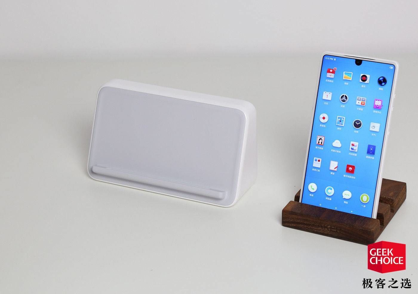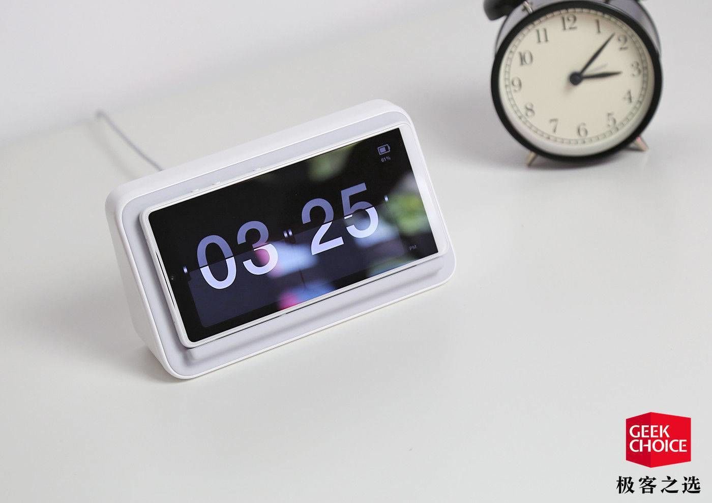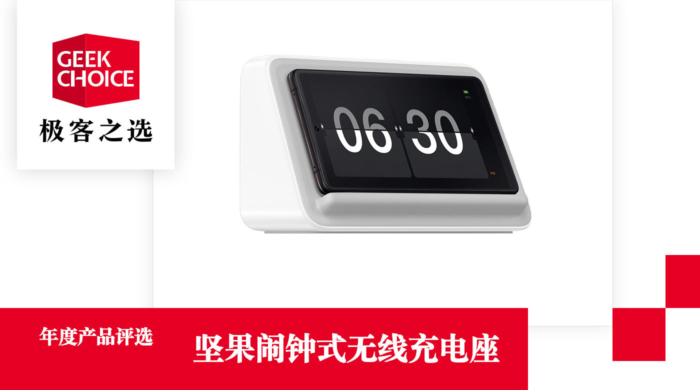 其中最特别的,要数坚果闹钟式无线充电座——它的设计十分独特,正面放置手机的一侧有一定的角度倾斜,你可以把手机横置放上去,然后就可以让手机「变身」闹钟。2018 年的「年度手机配件」,极客之选会把票投给这款「不满足基础功能」的充电底座。
