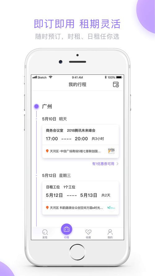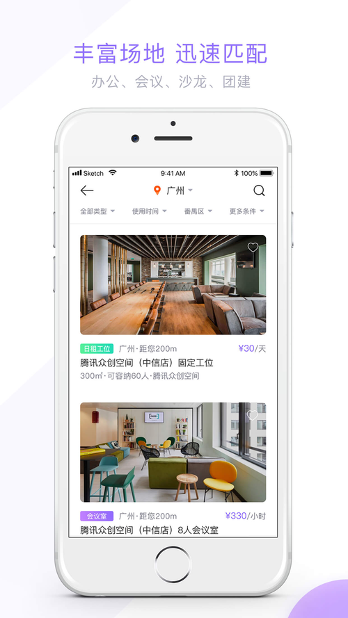 充分满足移动办公需求,租期低至 1 小时,可按小时/天/周/月等时间段租用场地。此外,用户还可以通过强大的搜索功能挑选适合自己的场地,只需「浏览——下单——到场体验」简单三步,即可开启美好的办公体验。