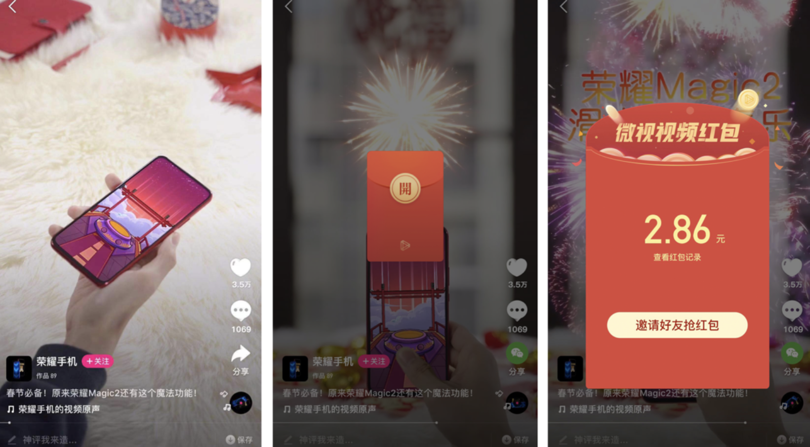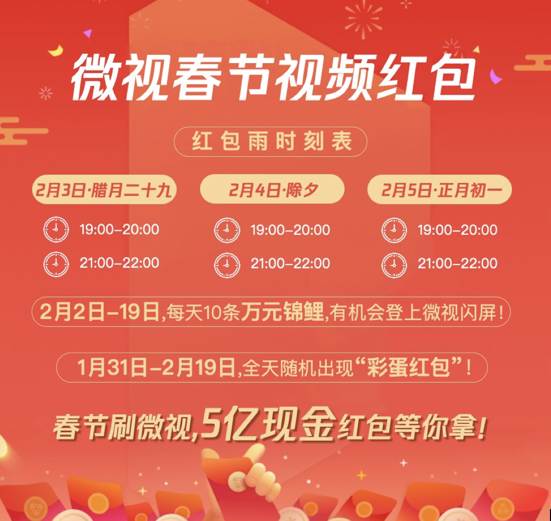 1 月 28 日,腾讯微视宣布将在春节期间推出视频红包的创新玩法,并上线微视视频红包春节活动,联合新华社等多家媒体,黄子韬、李易峰、陈立农、张杰等百余位明星,华为荣耀、联想等 60 多家知名企业,敦煌研究院、颐和园管理处等机构,发出 5 亿现金红包,为春节的年味加码。