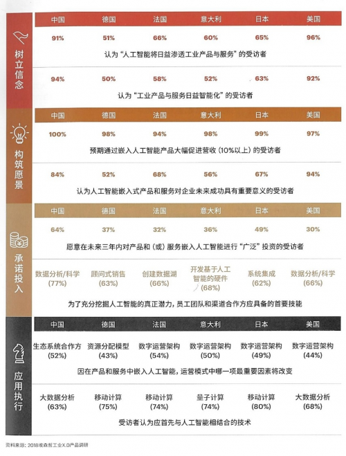 埃森哲对来自中国、法国、德国、意大利、日本、美国这六个国家的 500 家工业制造企业进行了调研,几乎所有受访企业都认同,将人工智能与移动计算、大数据分析等数字技术结合,能够提高运营效率,提供更有差异化的数字体验。这其中,中国的受访高管,在对人工智能产品对营收的促进上抱有很高预期的同时,行动力也极高,未来三年内进行广泛投资将人工智能嵌入产品和服务的意愿也远高于另外五个发达国家。