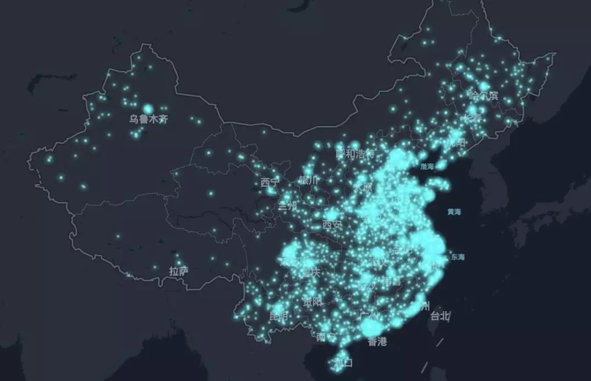迁徙图是在两点之间绘制弧线进行连接,并配以动画呈现移动效果的图像,主要用于展示不同地点之间人员、物品、车辆等流动的方向,具体场景如春节期间返乡人员迁徙图、某水产市场商品销售流向图等。