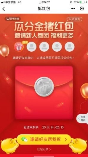 没红包怎么能算过节呢!购物之前先把红包领了,折扣价配合红包再减钱,剁手乐滋滋!首先进入苏宁拼购小程序,点击进入瓜分红包,邀请好友来帮拆,只要集齐 5 人即可拆红包(只要邀请的人中有新人红包会更大),最高可获得 70—10 的券。