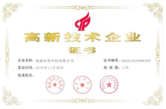 2018 年 11 月 30 日,经福建省科技局、福建省财政局、国家税务总局福建省税务局批准,正式认定福建知鱼科技有限公司为「国家级高新技术企业」。