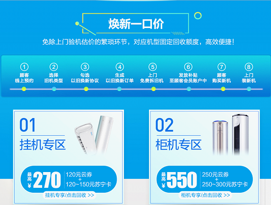 3 月伊始,苏宁升级了一站式以旧换新平台,实现拆旧机、领补贴、装新机一步到位,给予空调挂机每台 240-270 元、柜机每台 500-550 元的高额补贴。