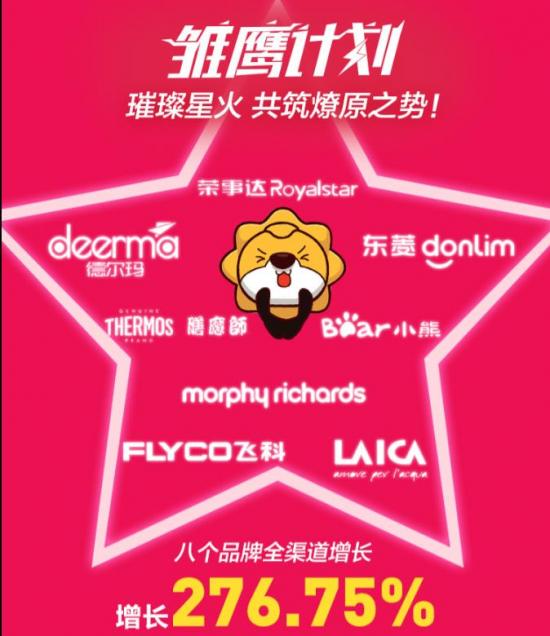 据了解,全民焕新节期间,苏宁围绕小家电提出了三大「品牌计划」(登顶计划、天量计划、雏鹰计划),其中雏鹰计划在此次全民焕新节期间率先启动,据苏宁生活家居发布的 315 战报显示,包括小熊、荣事达、德尔玛、东菱、摩飞、莱卡、飞科、膳魔师在内的雏鹰计划品牌成为 315 全民焕新节中的亮点品牌,实现了全渠道 276.75% 的增长。
