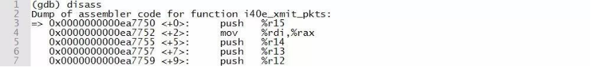 想要知道整个程序为什么不发包,最好的办法就是能够进入到程序中去看看具体的执行过程。对于 DPDK 用户态程序来说,GDB 显然是一个好用的工具。我们在发包程序逻辑中设置断点,并通过 disassemble 命令查看该函数的执行逻辑,反汇编之后足足有七百多行。(该函数中调用的很多函数都使用了 inline 修饰,导致该函数在汇编之后指令特别多)
