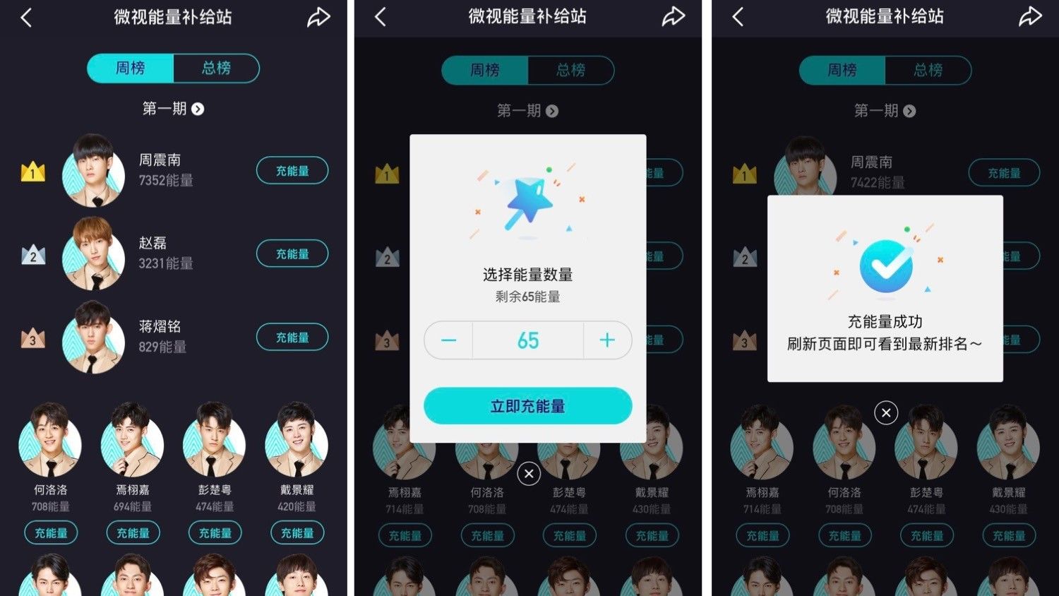 除了拍互动视频为学员助力,微视也为男团创始人准备了「能量补给站」、「当星探 分万年会员」、「饭拍饭制」三大站内活动,为学员们争取到了更多展示机会。