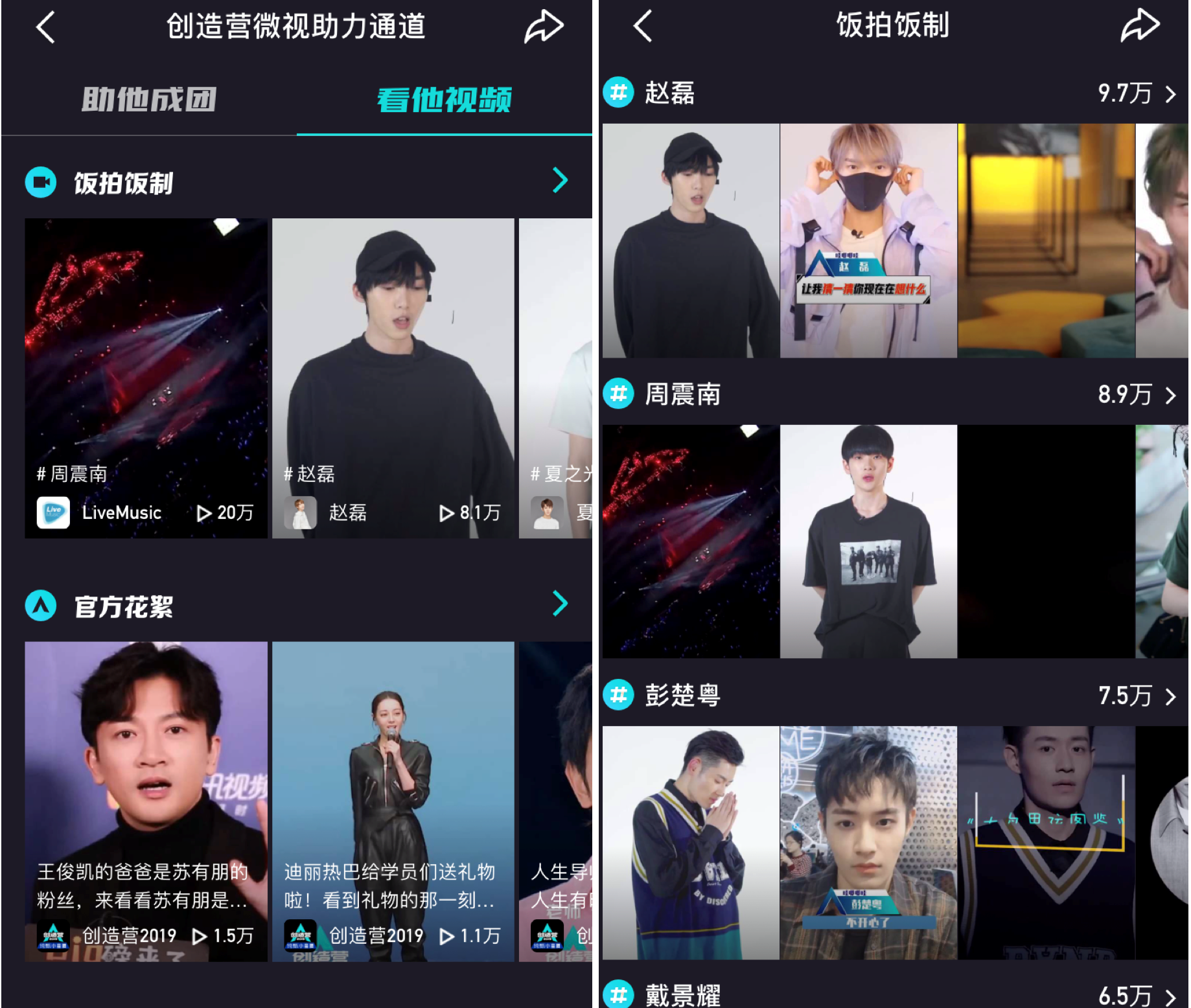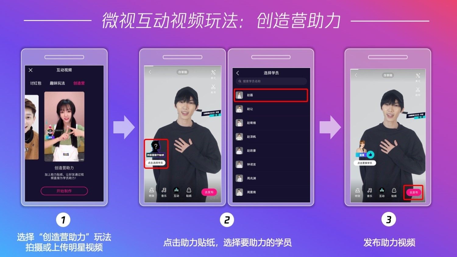 同时,男团创始人们还可以为学员制作个性化的互动助力视频:利用微视推出的「创造营助力」互动视频模版,「拍视频、选成员、发布并分享」三步即可为喜爱的学员助力。