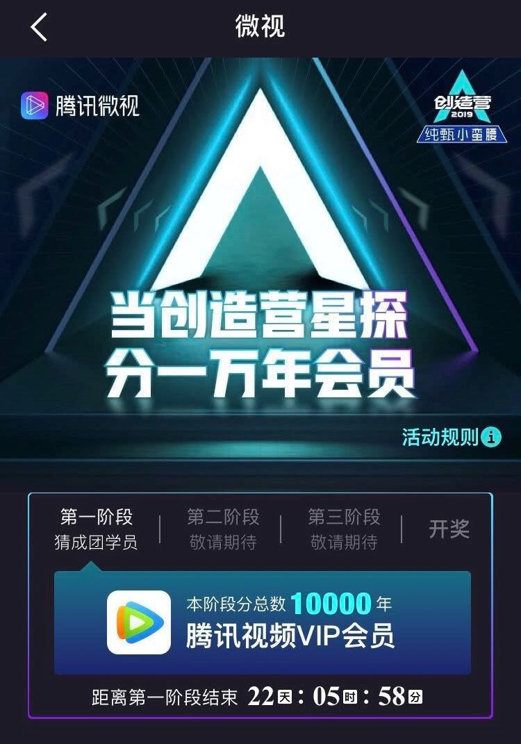 如果选择的学员最终成团,该男团创始人就能瓜分总时长为 10000 年的腾讯视频 VIP 月卡;如果邀请好友一起参与该活动,且其选择的学员最终成团,每邀请一位好友参加都将额外获得 1 次腾讯视频 VIP 月卡奖励。