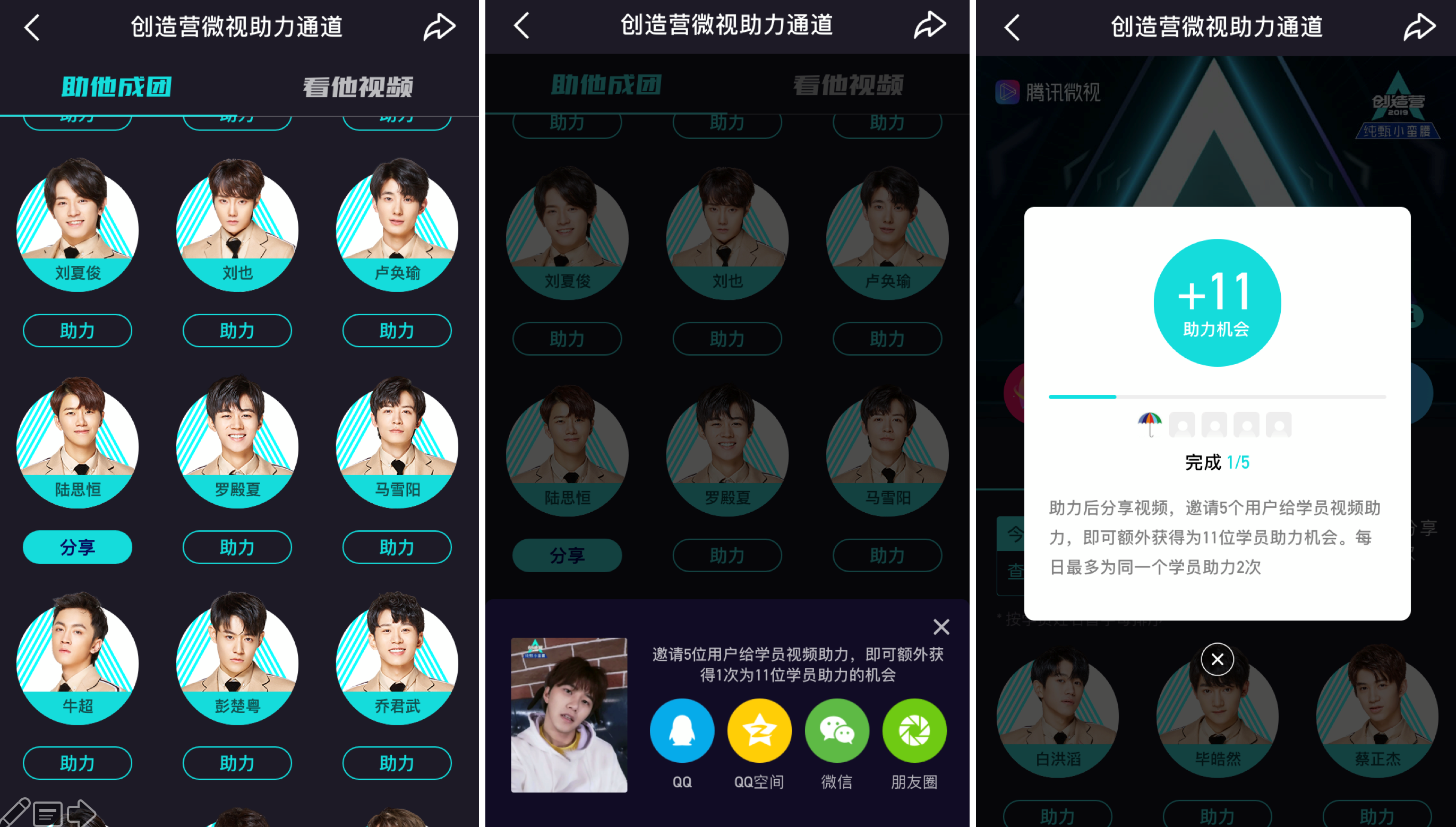 通过此次推出的互动视频功能,微视为每位学员都量身打造了一支互动助力视频。用户可进入助力通道,为喜爱的学员助力,并将互动助力视频通过微信、QQ 等社交平台与好友分享。好友可在微信、QQ 里直接点击该互动视频,完成助力。当助力好友数达 5 位时,用户还将额外获得一次为已助力学员再次助力的机会。