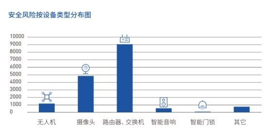 近年来,智能家居市场发展十分迅猛,智能摄像头、智能音箱、智能门锁等智能家居设备已进入越来越多的家庭。《白皮书》显示,本次IoT设备样本检测共发现16508个安全风险,其中智能家居设备存在的安全风险数量最多。单个设备平均安全风险数量按照类别划分,由高到低为智能音箱、摄像头、路由器/交换机、无人机、智能门锁。