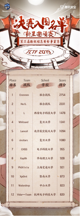 继国际赛(0CTF)决赛战队名单揭晓之后,第三届腾讯信息安全争霸赛(TCTF)线上预赛新星邀请赛(RisingStar CTF)成绩也已新鲜出炉:两支多校联合战队 Emmmm 和 Nu1L 分别荣获第一和第二名,第三名则由来自西安电子科技大学的 L 战队摘得。
