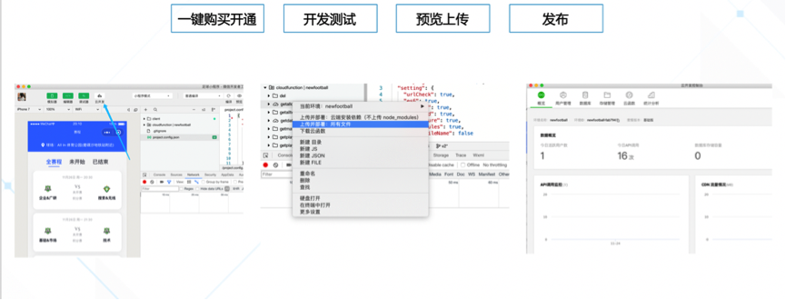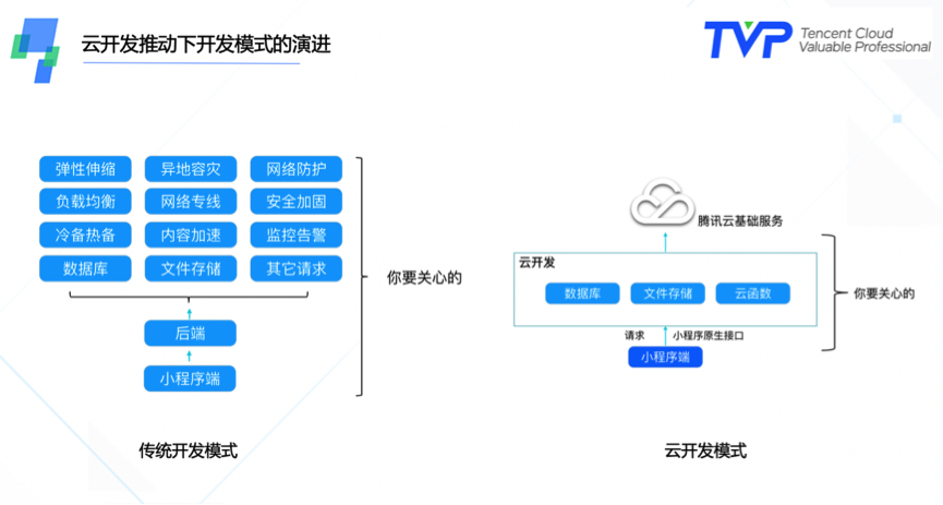 云开发,是腾讯云和微信团队联合开发的,集成于小程序开发者工具(IDE)的原生 serverless 云服务。它进一步降低小程序开发门槛,让前端可以包办小程序开发,提升开发效率,像调用 API 一样便捷,用户其实完全不用担心哪些是服务器的逻辑,他们都去向了哪里,只需要像前端函数一样去理解就可以。