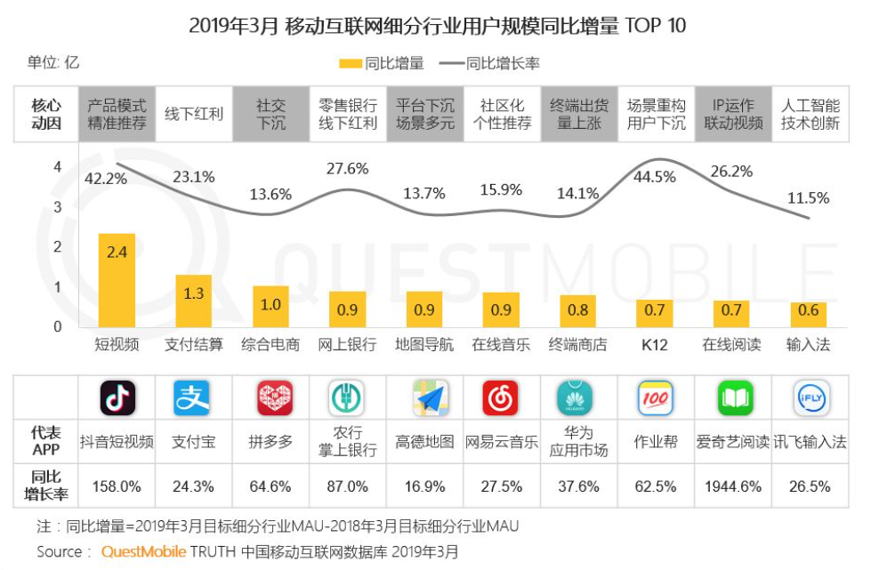根据 QuestMobile 最新发布的报告,三五线下沉渠道用户已经成为今年移动互联网用户增长的主要来源。在 3 月移动互联网 App 用户规模增长排行中,支付宝位列前十,同比增长 24.3%,其新增用户主要来自于对线下红利的挖掘。