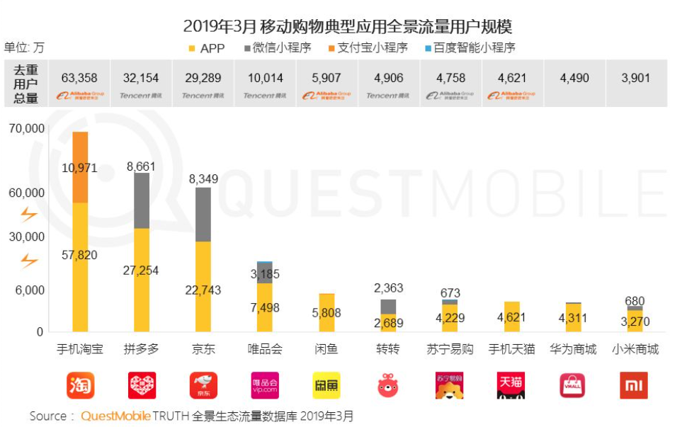 值得注意的是,在下沉市场表现出色的支付宝开始呈现出反哺阿里生态的能力。QuestMobile 的报告显示,支付宝小程序为阿里巴巴电商业务板块拓展了用户渠道,手机淘宝的支付宝小程序用户规模已经突破 1 亿。