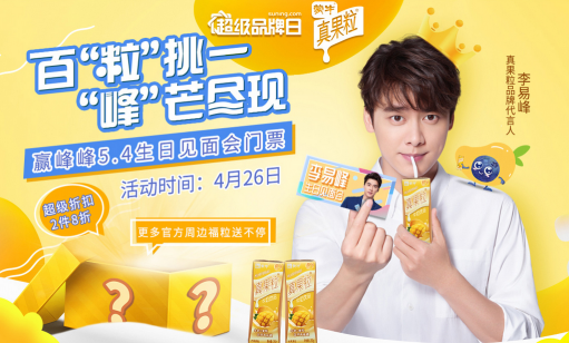 春暖花开的四月,一年一度的李易峰生日会也将于5月4日在成都举办。出道12周年的李易峰再次回到家乡庆生,这场仪式感满满的生日会也备受粉丝期待,生日会门票更是一票难求。4月26日,苏宁易购蒙牛真果粒超级品牌日来袭。当日,苏宁携手蒙牛真果粒送出重磅福利——消费者购买李易峰代言的真果粒品牌的芒果口味,即有机会赢取李易峰生日会门票!