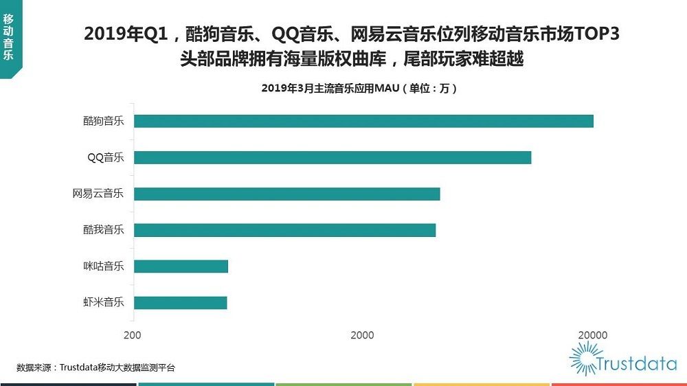 近日,知名移动互联网大数据监测平台Trustdata发布《2019年1季度中国移动互联网行业发展分析报告》。报告基于社交、电商、视频、直播、音乐、电台、资讯等数十个领域的数据进行研究,分析出中国移动互联网行业的最新发展趋势。其中,在移动音乐市场上,酷狗音乐、QQ音乐、网易云音乐位居前三,月活用户数远远超过尾部玩家。