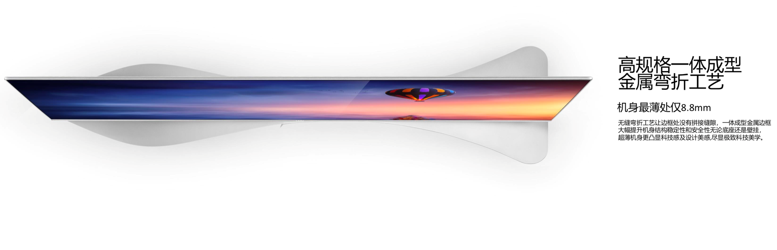 在产品工艺上,超 5 具备更高屏占比。普通电视采用前框包裹式封装技术,会牺牲一部分屏幕显示面积,而超 5 的全面屏创新性的采用贴合技术,使用屏幕无遮挡的超窄边框,得以实现「更大视野」的全面屏形态,整体的美观程度和工艺水平提升至新的高度。同时,金属超薄机身,更加纯粹和大气。无缝弯折工艺,让边框处没有拼接缝隙,一体成型金属边框,大幅提升机身结构稳定性和安全性。无论底座还是壁挂,机身最薄处仅 8.8mm 更凸显科技感及设计美感,尽显极致科技美学。