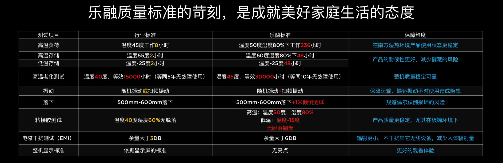 张荣东认为,一台好的电视产品,不只是炫技和极致科技的堆砌。乐融 Letv 对于最终产品的测试,始终坚持着比行业更为严苛的标准。例如,在温度 50 度湿度 80% 的情况下能工作 236 小时;在电磁干扰测试 (EMI) 中余量大于 6DB(行业标准是 3 DB)。乐融质量标准的苛刻,是成就美好家庭生活的态度。