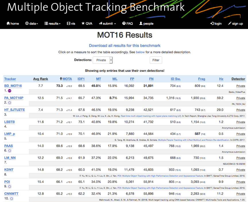 (MOT16 评测集排名,百度位居榜首)