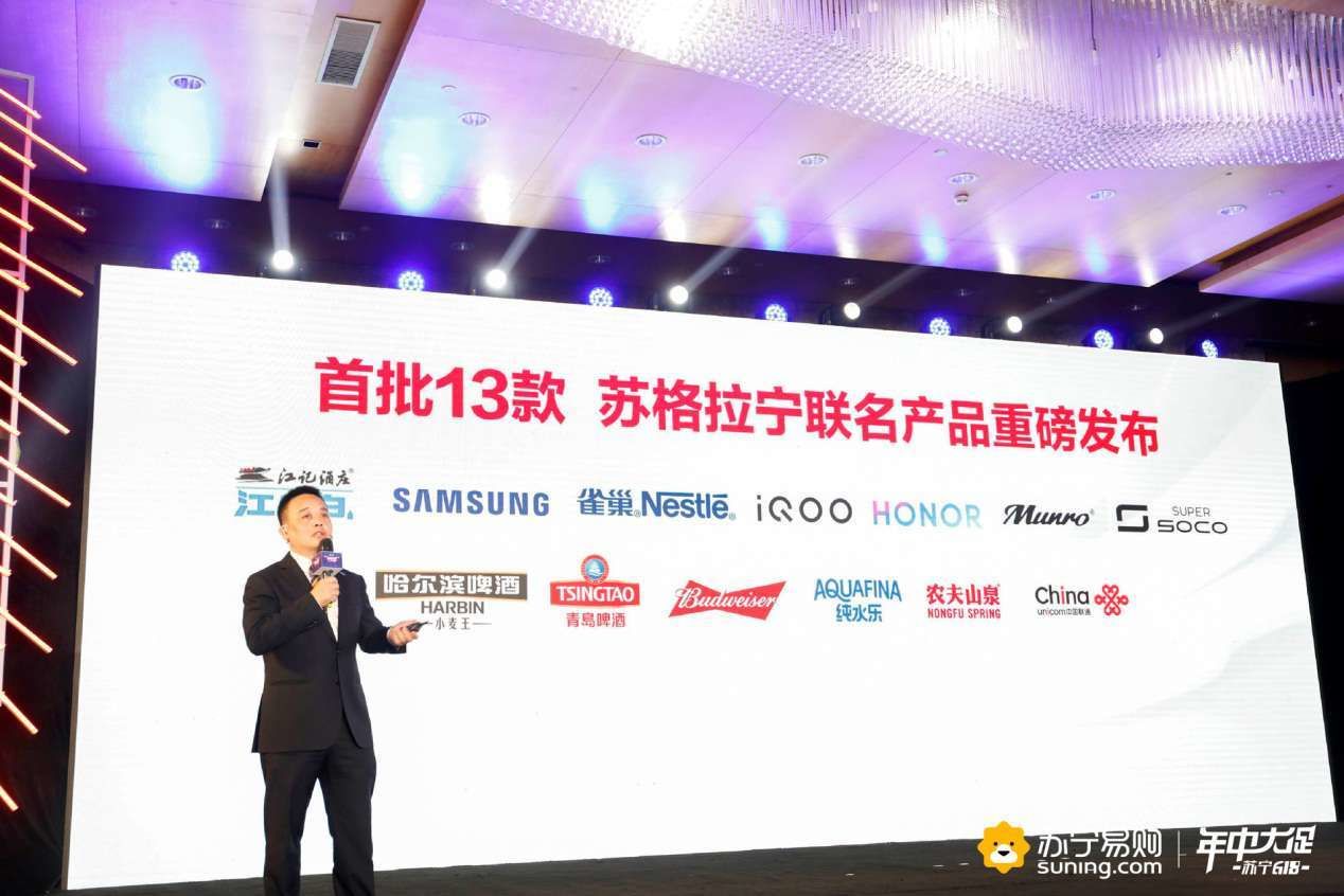 5月15日在苏宁618年中大促发布会上,苏宁易购总裁侯恩龙现场发布了首批苏格拉宁联名款产品,首批一共13款,联名款品牌分别为三星、荣耀、iQOO、中国联通、雀巢、江小白、哈尔滨啤酒、青岛啤酒、百威、农夫山泉、纯水乐、门罗、速珂,涉及到消费电子、快消、电动车等多个品类,苏格拉宁这个萌物IP,一时间非常抢手,成为多个品牌联名的对象。