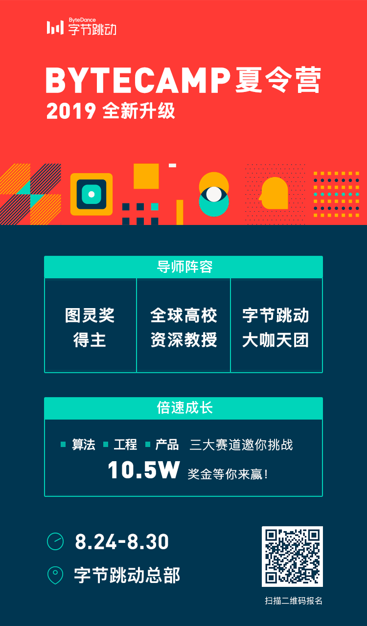 今年的第二届字节跳动夏令营将于2019年8月24日至30日在北京举行,本次夏令营以“封闭式课程+实践性项目”为主,营员不仅能与顶尖竞赛选手、工业界牛人、学术界专家深入交流,还能接触海量真实数据场景。