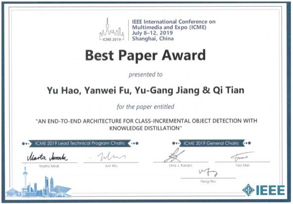 ICME是IEEE在多媒体领域的旗舰年会,会议轮流由美洲、欧洲、亚洲城市主办,本届主办地为中国上海。2019年度ICME共收到来自全球36个国家的研究人员投稿,投稿量破历史记录地达到1002篇,录用率为31%。经过多次严格评选,最终仅两篇论文获得最佳论文奖。该获奖论文前三位作者均为“复旦—极链智能视频技术联合研究中心”成员,第四作者为华为公司诺亚方舟实验室首席科学家田奇教授。