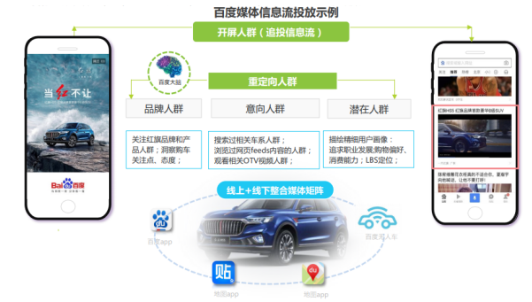 一汽红旗与百度的合作正是巨头时代下信息流广告投放的典型案例。在投放前期,百度作为平台方,借用百度大脑的AI能力自动划分出品牌人群、意向人群以及潜在人群等不同类别的目标用户,针对每个类型的不同用户,推送符合他们兴趣、意图的相关物料。此外,百度的“线上+线下整合媒体矩阵”,能够联动百度App、百度贴吧、百度地图等多种渠道分发相应的内容,在不同场景中与目标用户反复沟通,正向激励用户对上市新车的兴趣及转化。