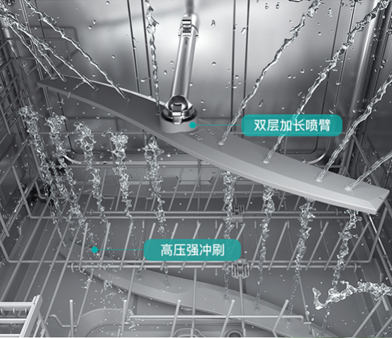 清洗方面,产品采取的是高温强力洗技术。高达75摄氏度的高压水温,能迅速溶解各类常见的餐具油脂。产品采取上下式双喷臂高压喷淋模式,26个喷水口和加长的高压强喷效果,能确保快速剥离粘连性强的污渍,确保清洁无任何死角。