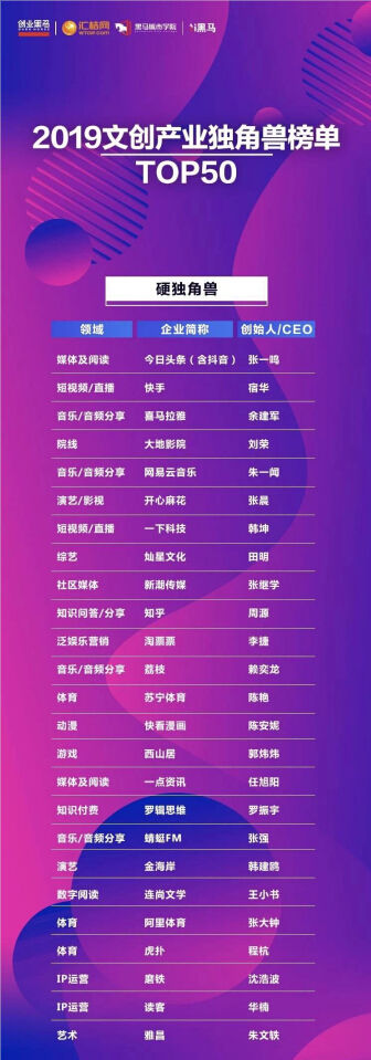 日前,创业黑马发布《2019 文创产业独角兽》榜单,十二栋文化、米未传媒、暴走漫画、笑果文化、唱吧麦颂、凯叔讲故事等一批动漫、影视、短视频企业上榜准独角兽榜单。榜单解析显示,2010 年-2015 年是文创产业独角兽诞生的黄金时代,众多企业享受到了移动互联网时代的红利,而面对资本寒冬的今天,一批新兴文创企业逐渐探索移动互联网「下半场」的新商业路径,逆势增长
