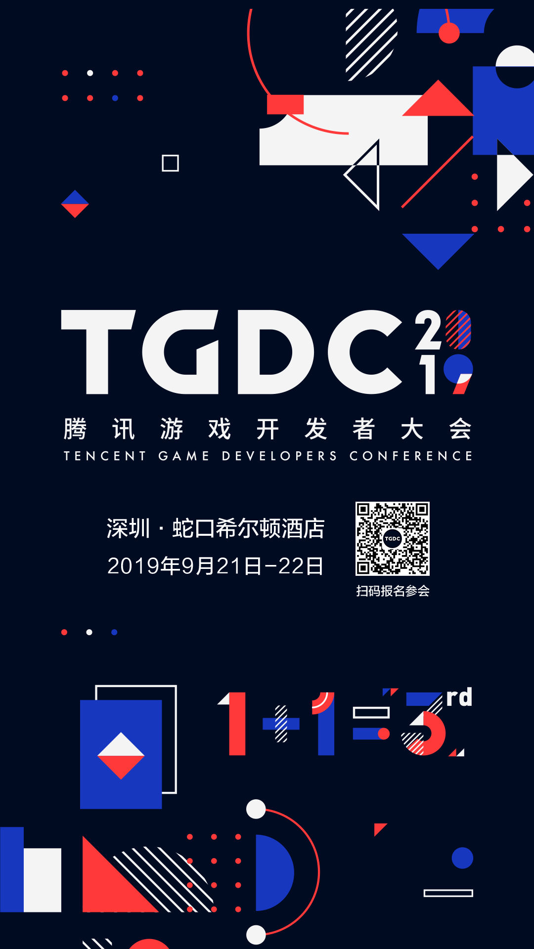 第三届 TGDC 以「1+1=3」为主题,希望游戏开发者和游戏热爱者能够在大会中碰撞出探索游戏无限可能的火花。大会诚邀每一位分享嘉宾与参会者在这里进行分享交流,1+1 并不是单纯的数量之和,而是思想碰撞交流后,产生远大于其本身的影响。正如,你我的相遇,各自秉承理念,通过交流又会产生新的理念。大会在 9 月 21 日上午将设置主论坛议题分享,下午则将同时开设产品、技术、艺术、市场及游戏价值五大分论坛,分别探讨剖析游戏相关领域的经验和理念。9 月 22 日则是 GWB 全球创意游戏合作盛典,届时将有精彩的主题分享、圆桌论坛和 GWB 腾讯创意游戏大赛颁奖典礼。