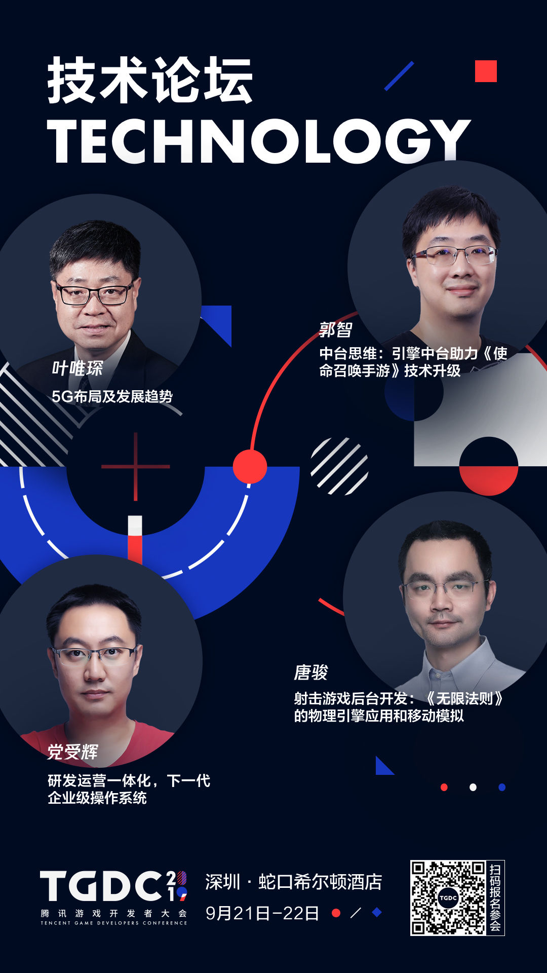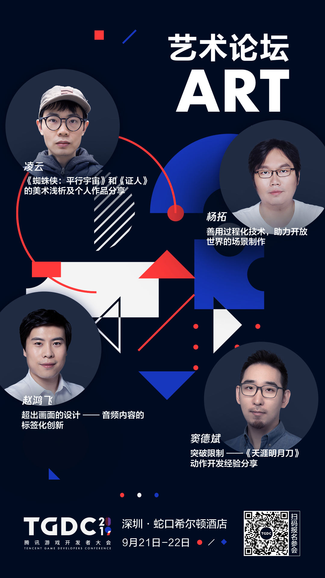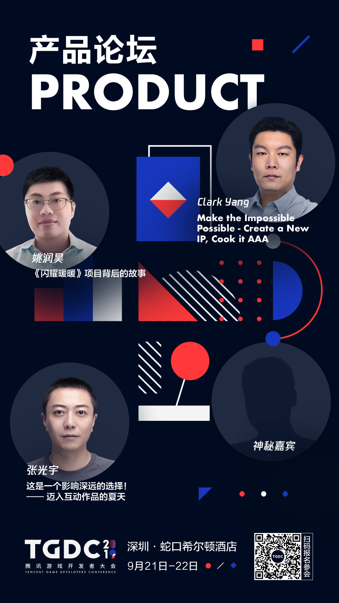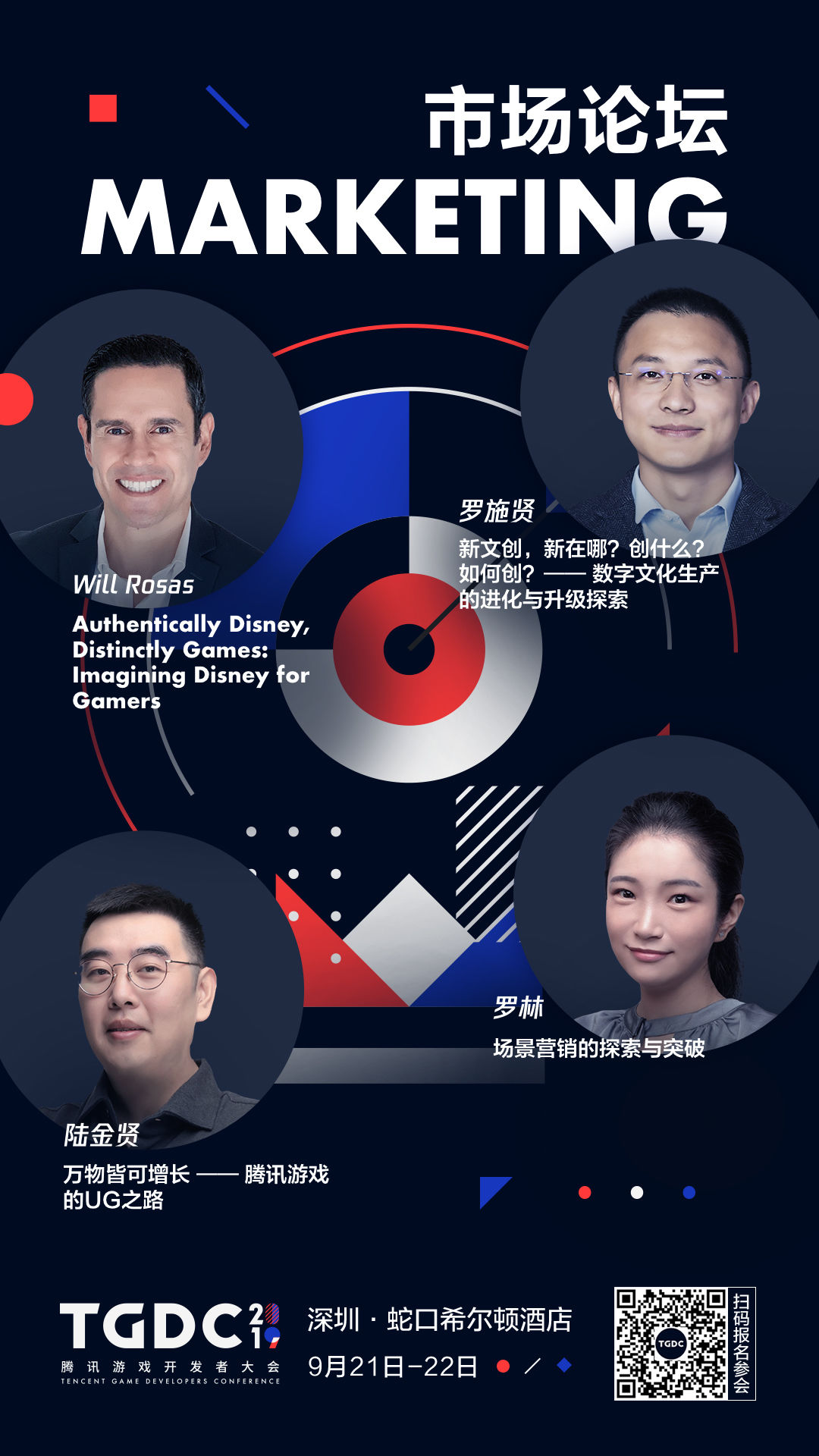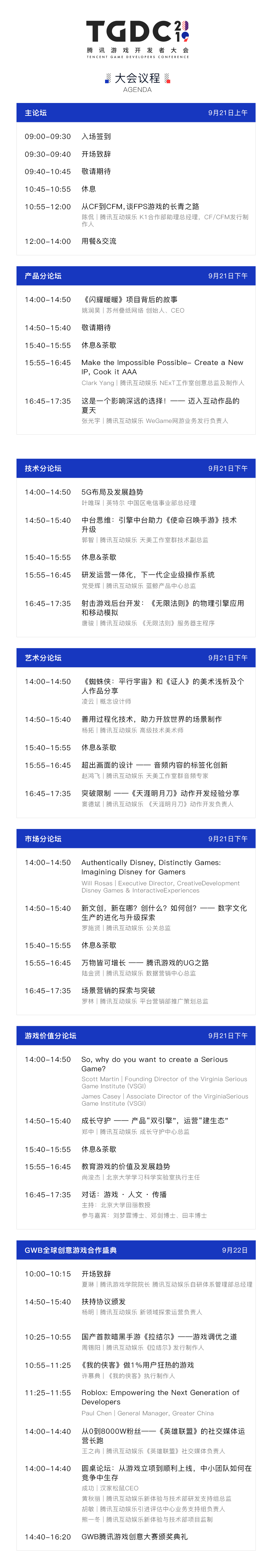 本届 TGDC 邀请到国内外众多重磅嘉宾。上午的主论坛,腾讯互动娱乐 K1 合作部助理总经理,CF/CFM 发行制作人陈侃将为大家带来「从 CF 到 CFM,谈 FPS 游戏的长青之路」的主题分享。而苏州叠纸网络创始人/CEO 姚润昊、腾讯互动娱乐 WeGame 网游业务发行负责人张光宇等将在下午的产品分论坛上为大家带来「《闪耀暖暖》项目背后的故事」及「迈入互动作品的夏天」等相关议题分享。英特尔中国区电信事业部总经理叶唯琛和腾讯互动娱乐蓝鲸产品中心总监党受辉为大家分享当前热度最高的「5G 布局及发展趋势」和「研发运行一体化下一代企业级操作系统」。除了这些「硬核」的内容分享,在艺术分论坛上,知名概念设计师凌云也带来了《蜘蛛侠:平行宇宙》和《证人》的美术浅析,腾讯互动娱乐高级技术美术师杨拓还将与大家分享「开放世界的场景制作」。同时在市场分论坛上,大会重磅邀请到迪士尼游戏与互动体验创意发展执行董事 Will Rosas,他将从迪士尼经典 IP 打造的角度谈谈对游戏的借鉴意义。腾讯互动娱乐公关总监罗施贤也将进一步解析何为「新文创」,同时与大家探讨数字文化生产的进化和升级。